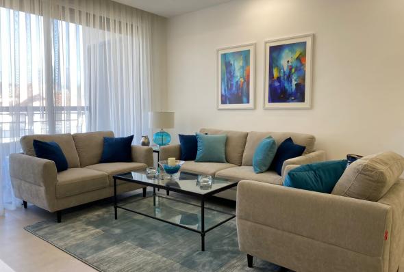 -100 sqm apartment -Super deluxe finishing -2 bedrooms (1 master) -2 bathrooms -Salon -Installed kitchen with all appliances -Central heating and cooling -Garage