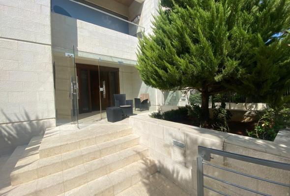 230 sqm furnished ground apartment Super deluxe finishing 3 bedrooms (1 master) 3 bathrooms Salon Living room Installed kitchen with all appliances Central cooling system Garage