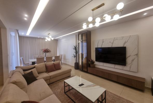 -185 sqm modern apartment -Super deluxe finishing -3 bedrooms (1 master) -3 bathrooms -Two salons -Living room -Installed kitchen with all appliances -A/C Units -Garage
