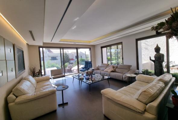 200 sqm indoor space 100 sqm outdoor terrace Super deluxe finishing 3 bedrooms ( one master ) Living room Installed kitchen with all appliances Heating by fuel A/C units Garden Garage