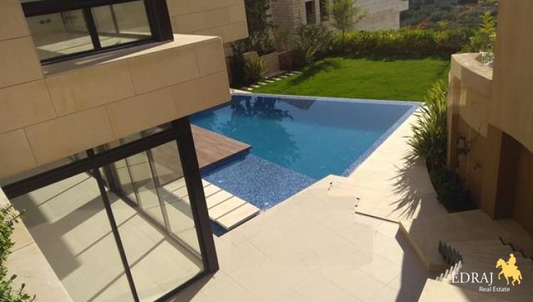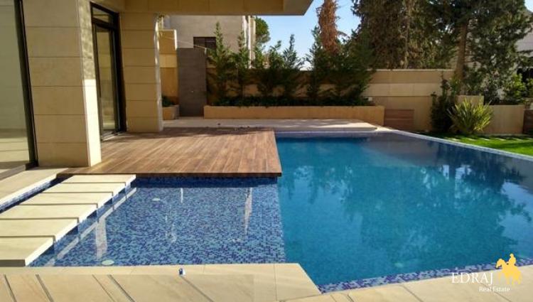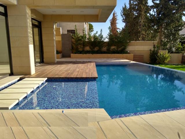 حمام سباحة وشرفات مليئة بالعشب